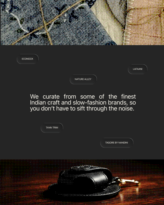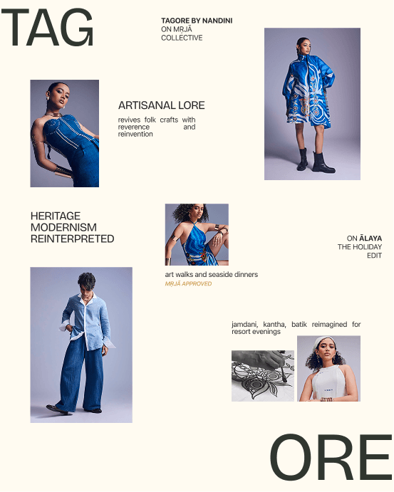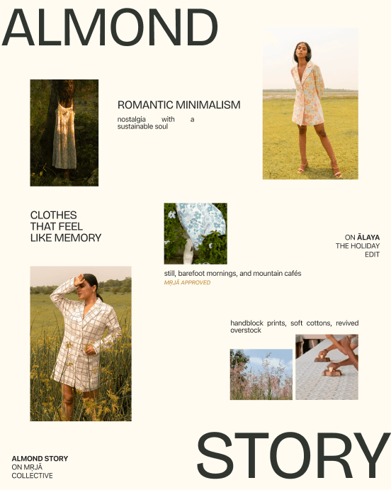 Mṛjā Collective aggregates India’s finest slow fashion silhouettes rooted in craftsmanship. we reimagined the platform as a magazine in motion and shaped an experience where editorial meets commerce, where garments and artisans are introduced, not listed. an interface built to let stories lead and slow fashion take the front page.
