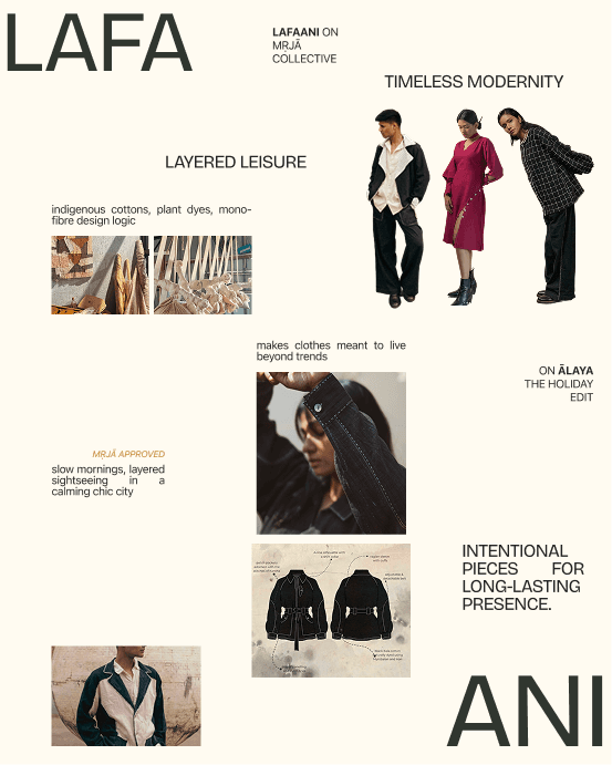 Every scrap is reborn—upcycled into accessories or repair kits. Lafaani’s designs are zero-waste by intent, and each garment can return to the earth at the end of its life.